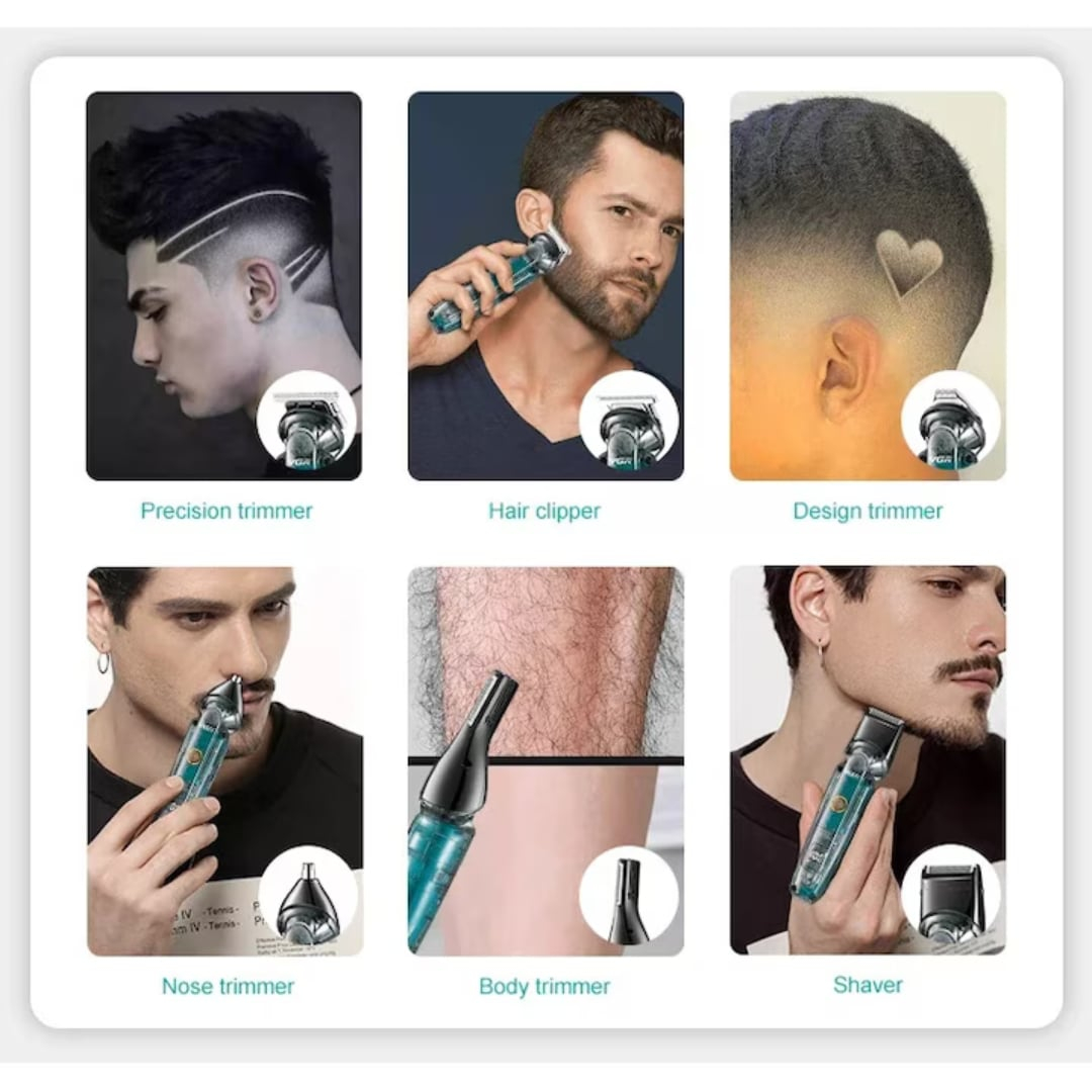 Mașină de Tuns Electrică Transparentă, 6 Capete Interschimbabile, Rezistentă la Apă IPX6, Lame Inox, Afisaj LED, Acumulator 1200 mAh, Încărcare USB-C